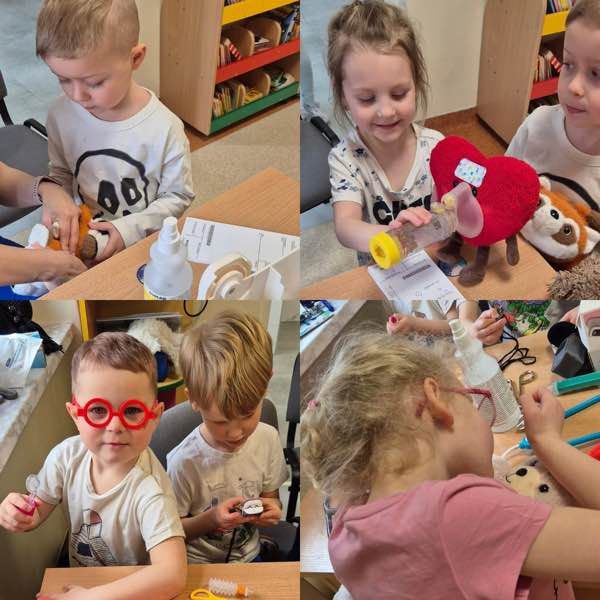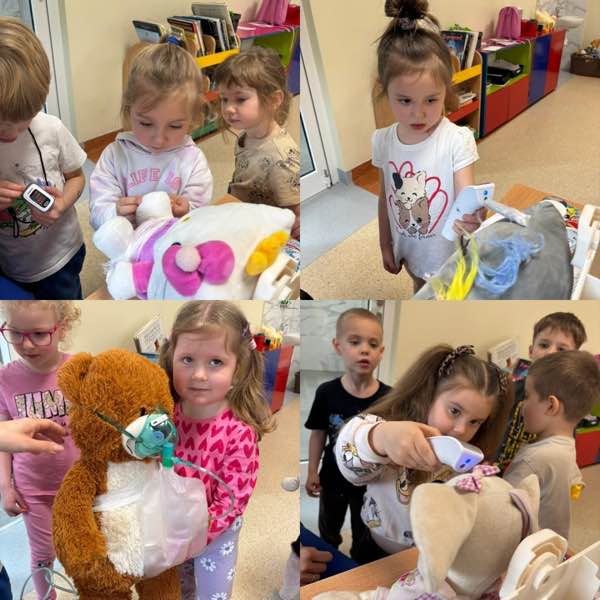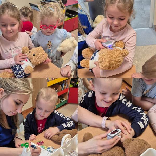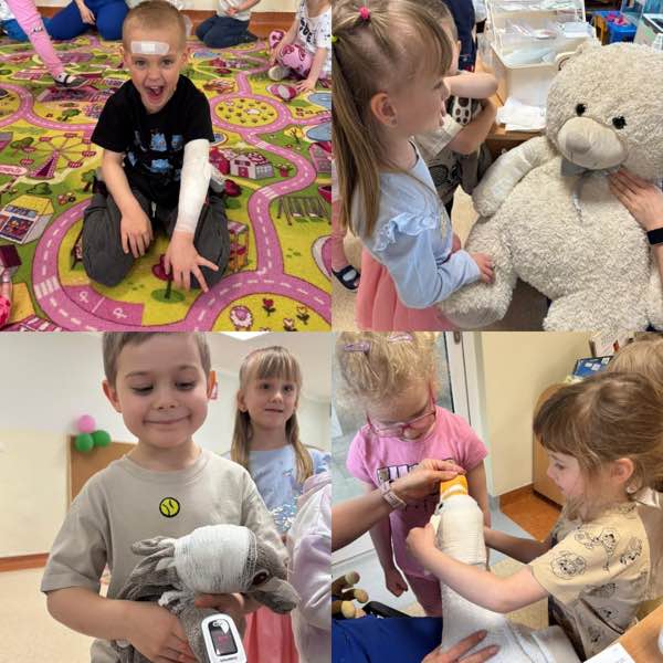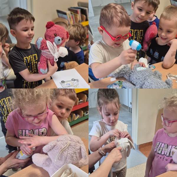 Następnie otworzyliśmy „Misiową Klinikę”. Dzieci wcieliły się w rolę opiekunów i lekarzy dla swoich chorych misiów.